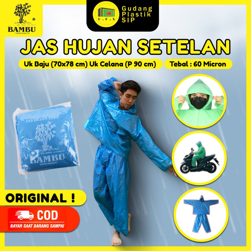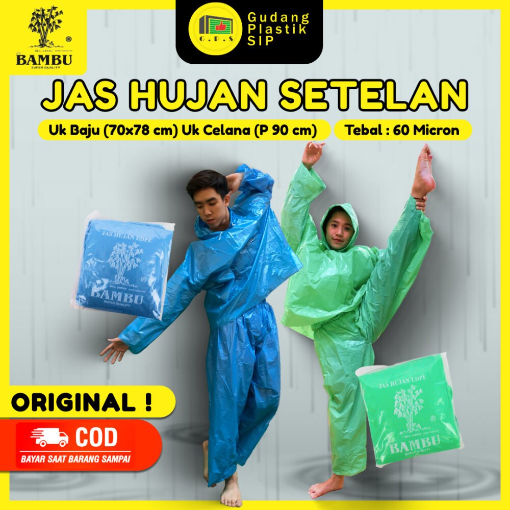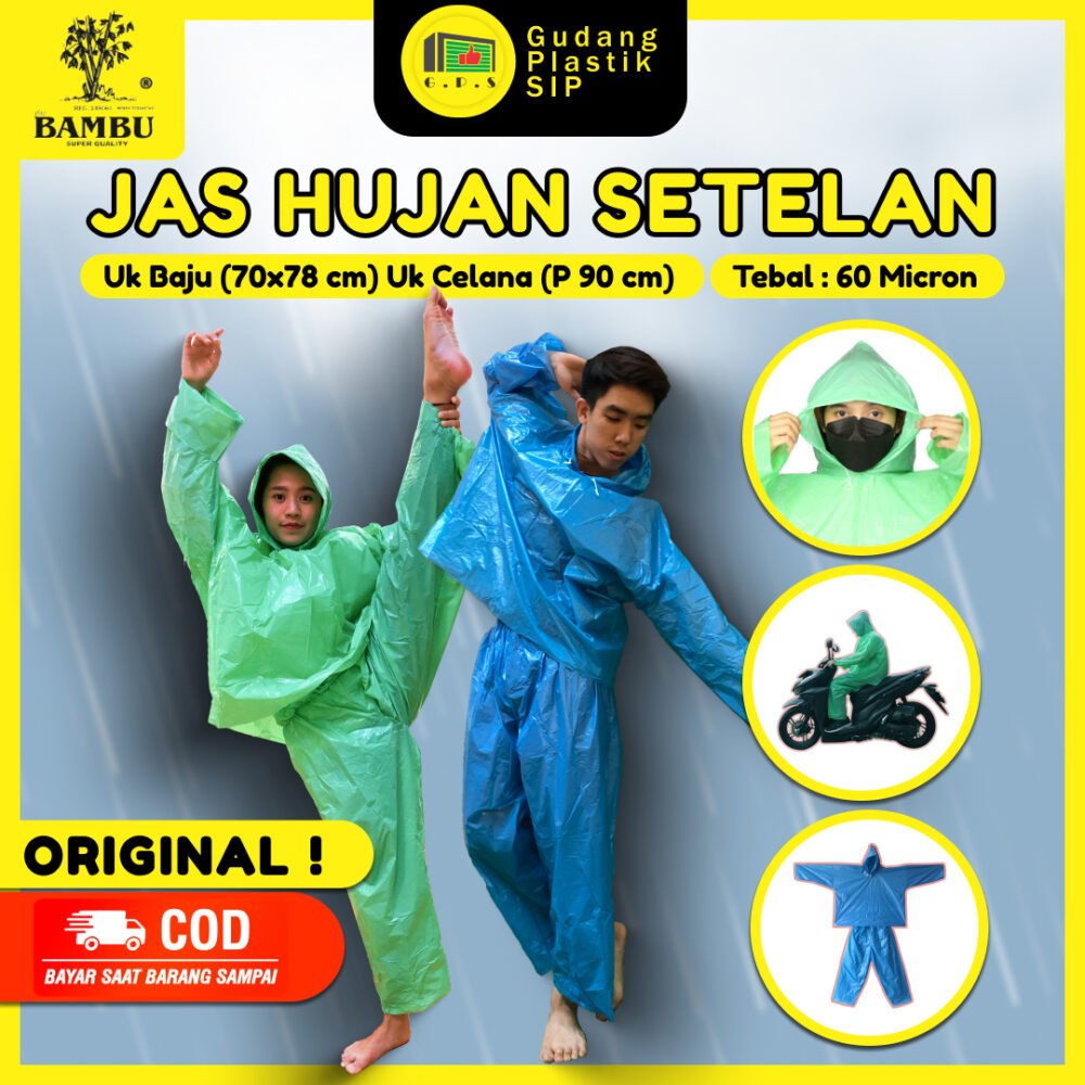 Jas hujan setelan bambu yaitu terdiri dari jaket dan celana, cocok untuk pengendara sepeda motor karena lebih leluasa bergerak.Â